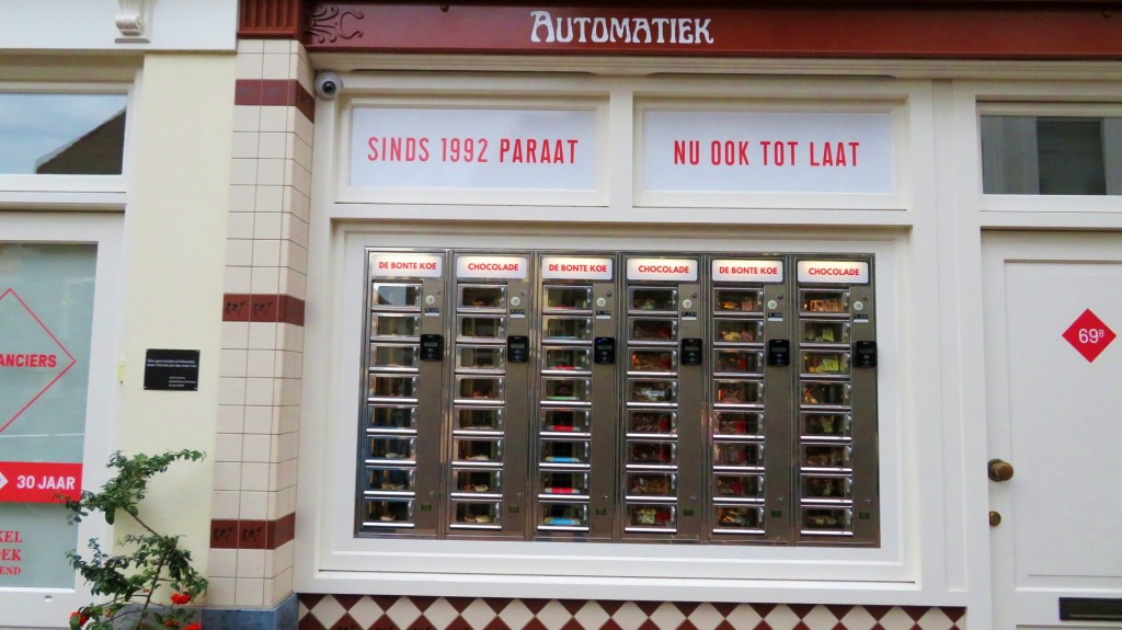 De Bonte Koe is al sinds 1992 gevestigd in Schiedam en heeft onder andere vestigingen in Rotterdam en Den Haag. Ter ere van hun dertig jarig bestaan kun je hun lekkernijen ook krijgen in de chocolade-automatiek. Dat is weer wat anders dan een kroketje uit de muur.