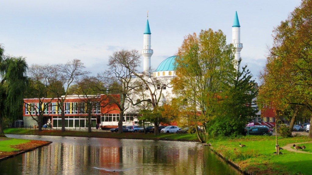 Ik wandel het Strickledepark uit en kom bij het metrostation Troelstralaan en wandel het groen weer in. Achter de bomen zie ik de minaretten van Islamitisch Centrum Yildiz.