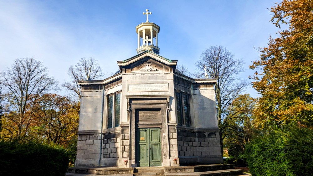 Midden op de begraafplaats zie ik een veelhoekig neoclassicistisch kapel uit 1853. Met veel kracht krijg ik één van de toegangspoorten van de voormalige dodenakker open. Ik wandel langs de oude graven.