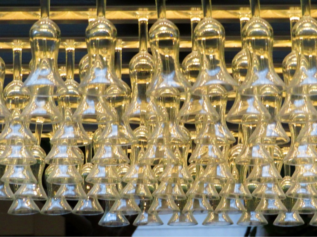 Een leuk detail is dat de lamp boven de leestafel bestaat uit honderden jeneverglaasjes