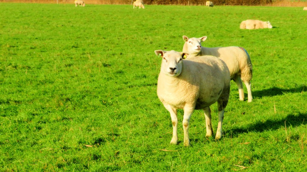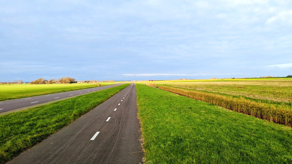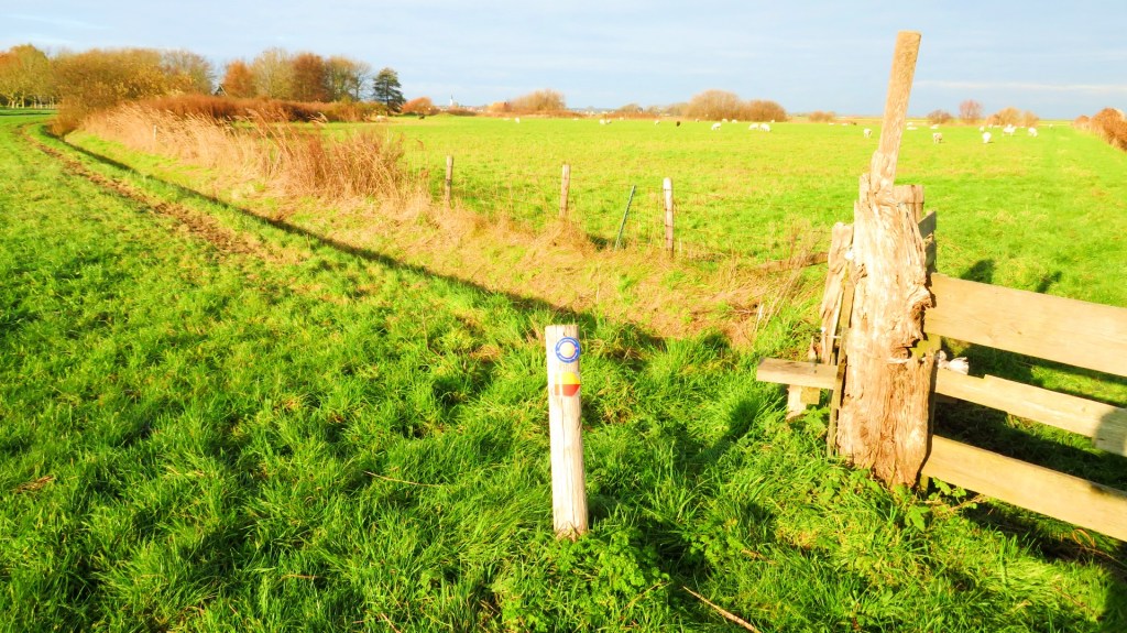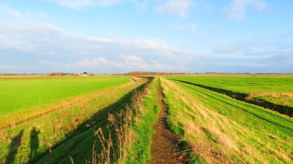 Het eerste deel van de wandeling gaat over een fietspad. Af en toe haalt een auto me in. Gezien het buiten het seizoen is, kom ik weinig fietsers of wandelaars tegen. Even wandel ik op dit lange rechte pad, totdat ik bij een weiland met Texelse schapen kom. De wandelroute gaat dwars over het land. De schapen zijn niet bang en komen zelfs even kijken. Even deel ik het weiland met de schaapachtige beesten. Ik verlaat het grasland en wandel verder over een grindpad.
