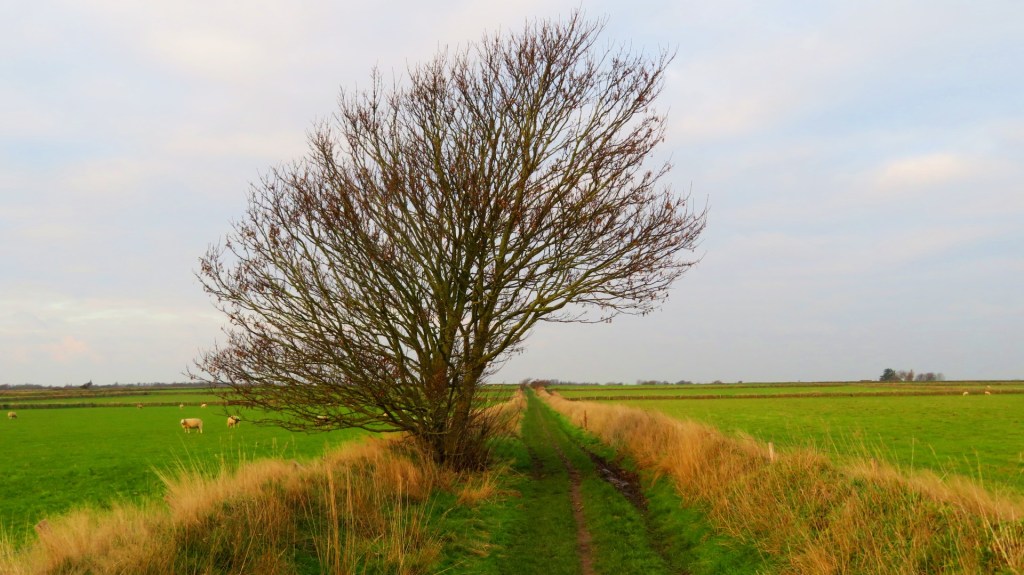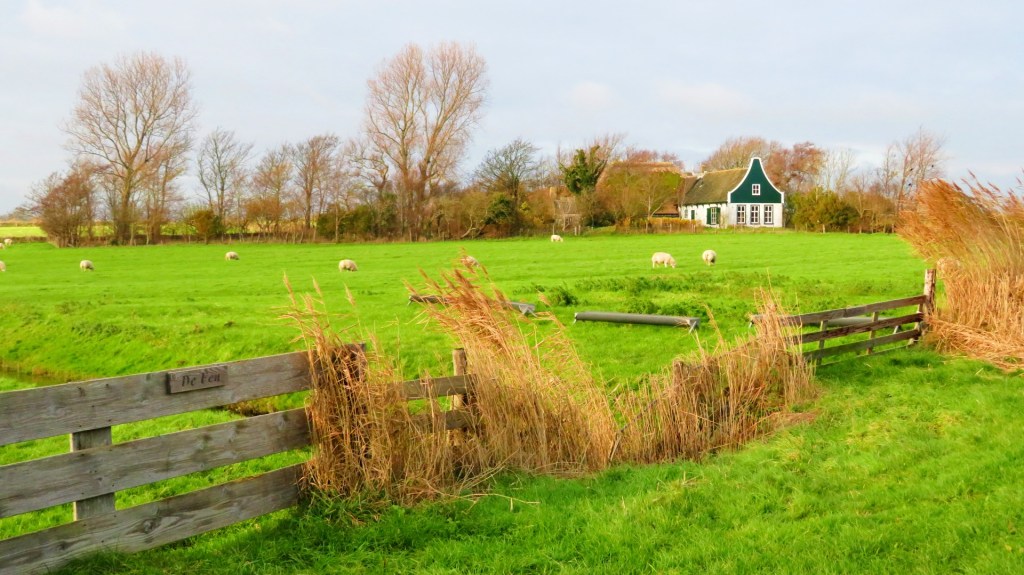 De wandelroute gaat verder over een grasdijk. Mijn wandelschoenen zakken weg in de drassige ondergrond. Ik probeer de klei te ontwijken en wat meer op het gras te lopen. Het is al een tijdje geleden, dat ik mijn hoge wandelschoenen aan heb. Door het steeds corrigeren van mijn voeten, krijg ik wat last van mijn hakken. In de verte zie ik het silhouet van het schilderachtige dorp Oosterend. Ik verlaat de grasdijk en kom nogmaals langs een schapenboet.