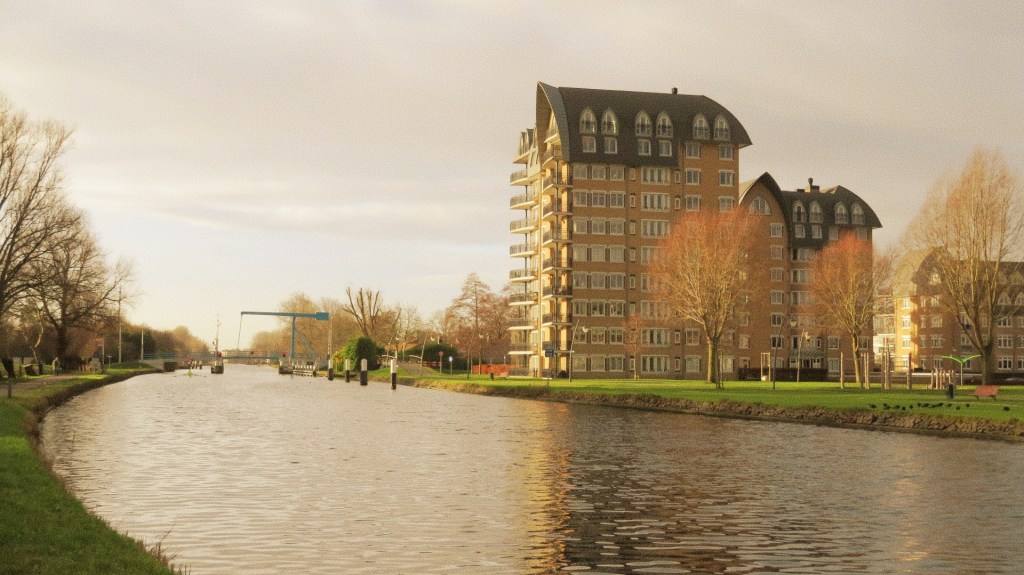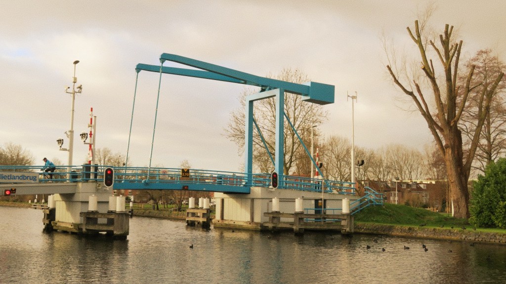 Al snel kom ik bij de Vliet. Met de blauwe Vlietlandbrug kom ik aan de andere kant van het water. Ik kies één kant van de weg, want het kan hier druk zijn met wielrenners. Vanaf dit punt heb ik een prachtig zicht op de Art Nouveau huizen van Park Allemansgeest. Deze Vinex-wijk heeft de allure van een chique wijk. De ontwikkelaars lieten zich inspireren door gebouwen uit de Witte Singel in Leiden en de Denneweg in Den Haag. Je vindt er zwierige huizen met verticale ramen en krullende hekwerken. Ook de bruggen en lantaarns zijn voorzien van de sierlijke details van de architectuurstijlen Jugendstil en Art Nouveau.