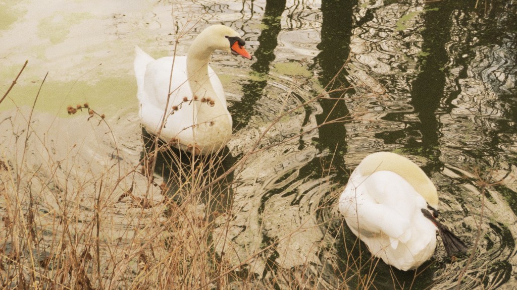Ik passeer oude boerderijen, waarvan enkelen nog in gebruik zijn. In de tuin scharrelen kippen en in de vijver voor één van de boerderijen zwemt een zwanenpaar.