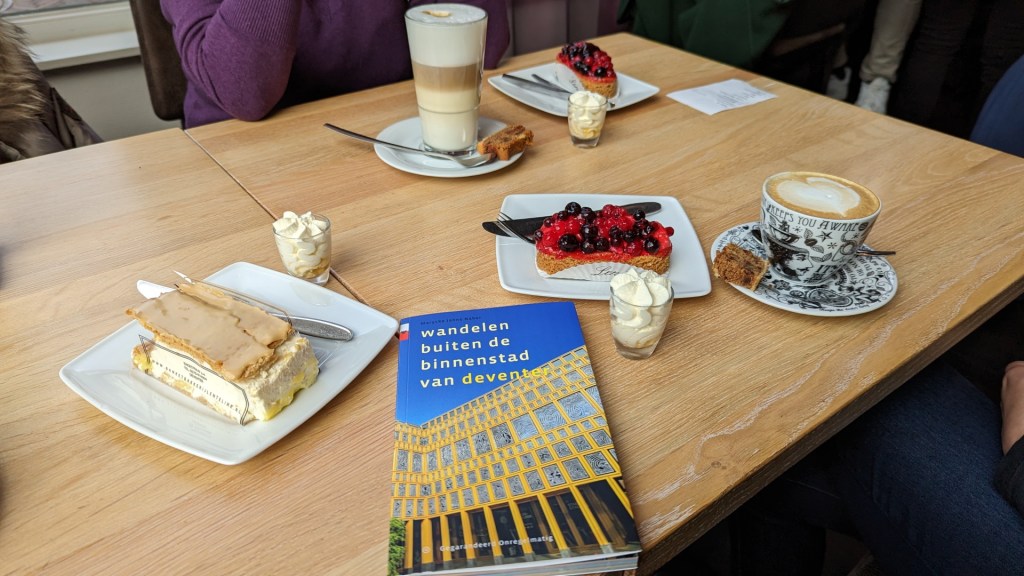 Ik dwaal door de gezellige straatjes en bij de Engestraat 2 tegenover de nieuwe bibliotheek strijk ik neer bij Lentelink Banketbakkerij Chocolaterie. Ik bestel een cappuccino en een bosvruchtentaartje. Het wordt geserveerd met een klein glaasje Amaretto met slagroom. Bij de cappuccino zit ook nog een plakje Deventer Turf. Wat een verwennerij zeg! Als ik afreken neem ik ook nog zo overheerlijke turf mee voor thuis.