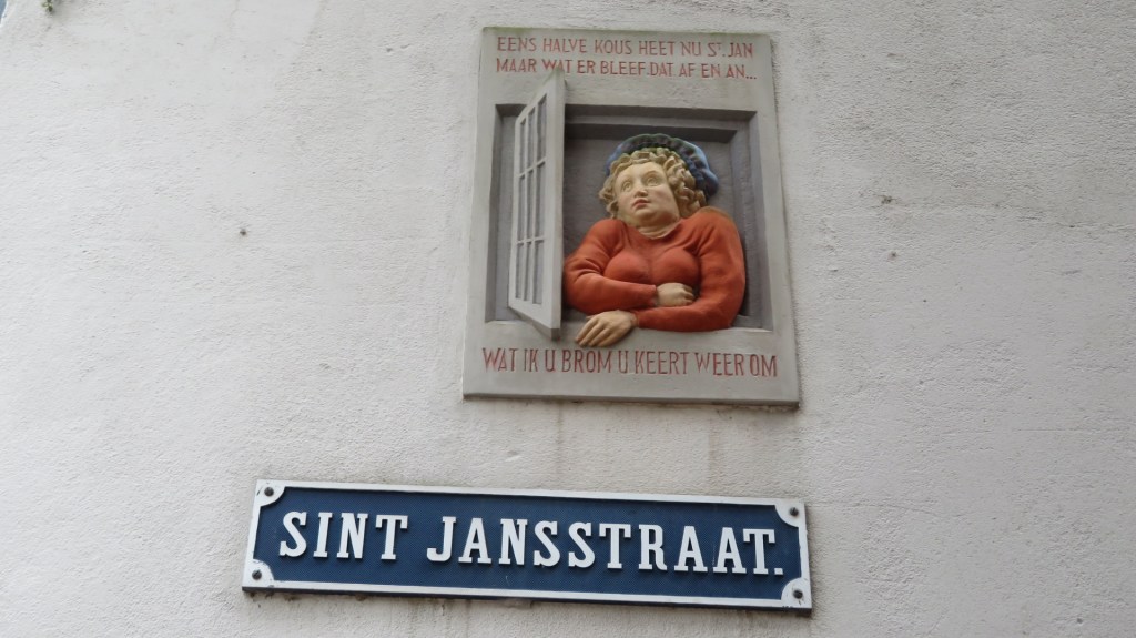 Ik verlaat het hypermoderne gebouw en wandel weer richting het Grote Kerkplein. Ik passeer de Sint Jansstraat waar een gevelsteen van Ton Mooy is te zien. De steen is voorzien van de tekst van dichter J.C. van Schagen “Een halve kous heet nu St.Jan maar wat er bleef dat af en an…. Wat ik u brom u keert weer om”. Het verwijst naar het verleden van deze locatie. In dit gebied oefenden dames van lichte zeden hun beroep uit.