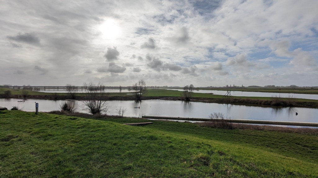 Ik verlaat de kade en wandel over een klein bedrijventerrein. Bij Deventer Kano Vereniging neem ik een graspad en heb een mooi uitzicht over de IJssel.