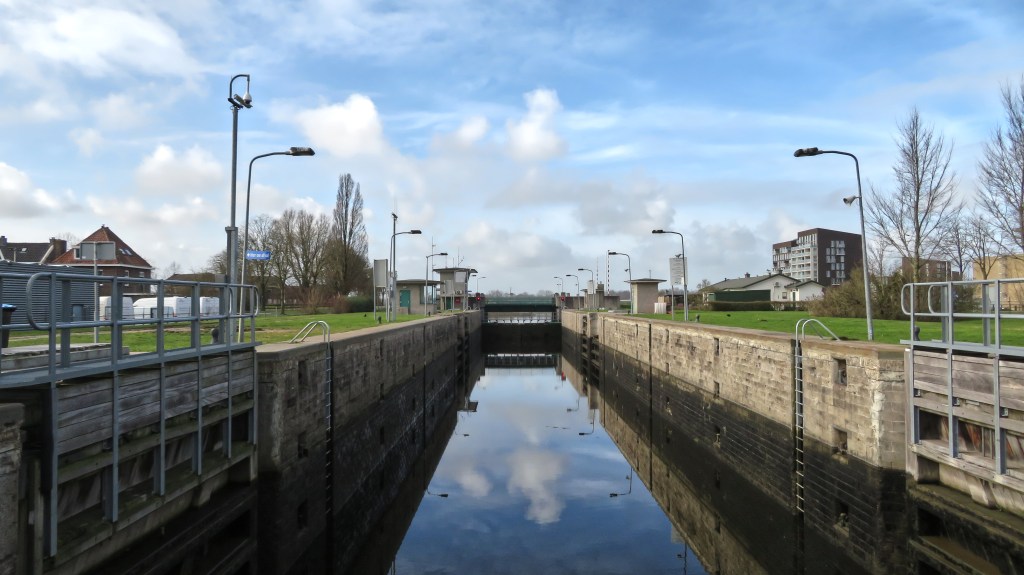 Ik wandel langs de Prins Bernhardsluis. Aan de overkant zie ik een opvallend gebouw, de Zwarte Silo, dat tegenwoordig in gebruik is als evenementenlocatie.