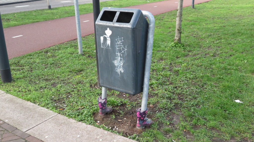 Prullenbak met regenlaarsjes