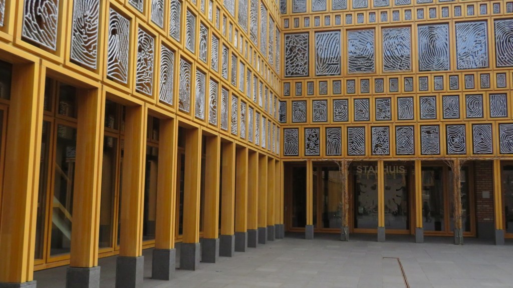 Tegenover de gotische kerk staat het moderne stadhuis van Deventer. Op de plek waar ooit de schouwburg stond heeft Loes ten Anscher het stadskantoor ontworpen. Ze heeft in de ramen van het nieuwe stadhuis 2264 vingerafdrukken van Deventenaren verwerkt. Ik wandel naar de binnenplaats van het pand. Onderin het stadhuis bevindt zich een duurzaamheidscentrum. Ik wandel even naar binnen en een vriendelijke vrijwilligster vertelt me alles over het centrum.