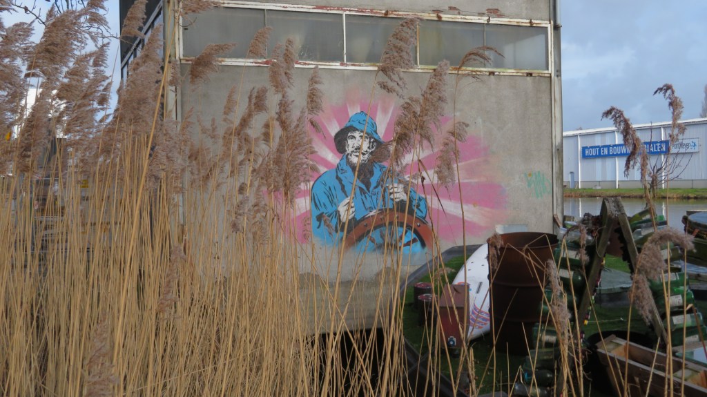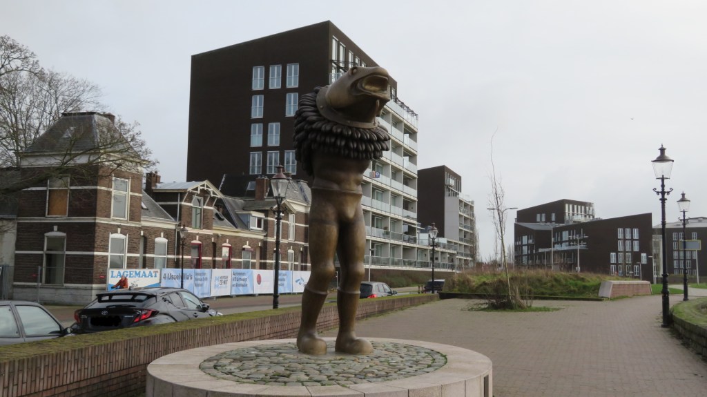 Ik aai het speelse beestje over zijn zachte bolletje. Ik passeer een moderne sculptuur “Visman” van de kunstenaars Space Cowboys. Het symboliseert de vroegere handelsproducten van Deventer.