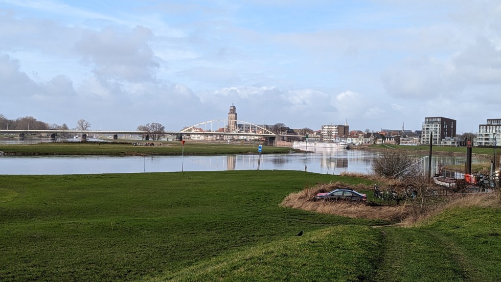 Ik maak een buitenommetje en wandel langs een 14e -eeuwse oude stadsmuur. Ik loop richting de kade van de IJssel. Het zonnetje begint verder door te breken. Ik wandel langs de IJssel. Een man met een bruine jonge labrador wandelt me tegemoet.