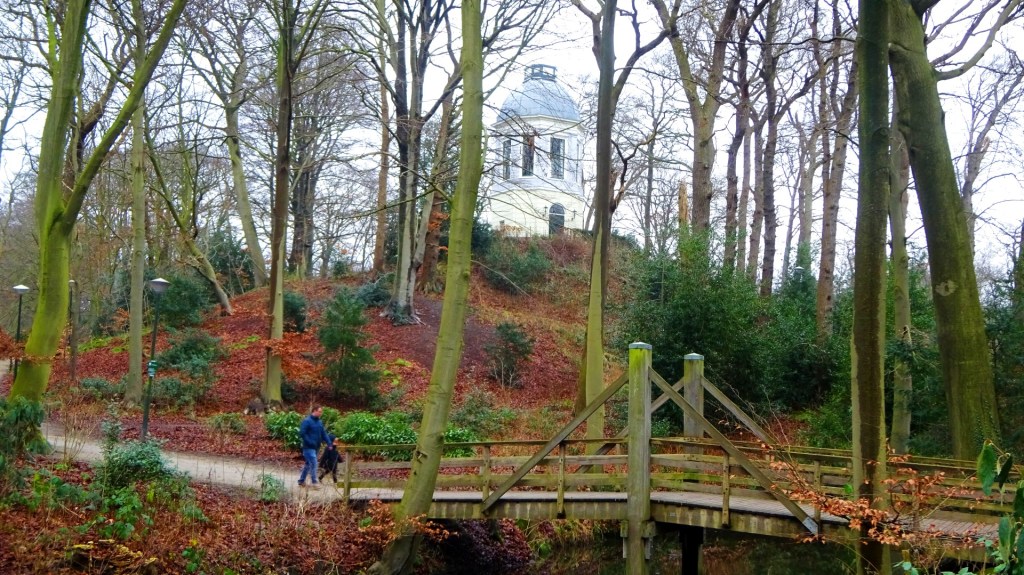 Terwijl ik door het landgoed wandel, kom ik langs bijzondere bouwwerken zoals de theekoepel op een heuvel. Door de met mos bedekte boomstronken lijkt dit landgoed wel een sprookjesbos.
