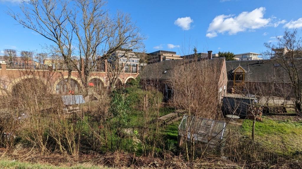 In 2015 werd de buitenplaats een ontmoetingsplek. Ik heb wel behoefte aan een pauzeplek en loop bij het Landhuis binnen. Echter is er geen plek en ik vervolg mijn route. Even wandel ik door de woonwijk Oog en Al en kom ik bij het Amsterdam-Rijnkanaal. Op het gras langs het water spelen twee grote bruine honden. Er staat een behoorlijke wind en het voelt fris aan. Een tijdje loop ik langs het water totdat ik bij de Dafne Schippersbrug kom.