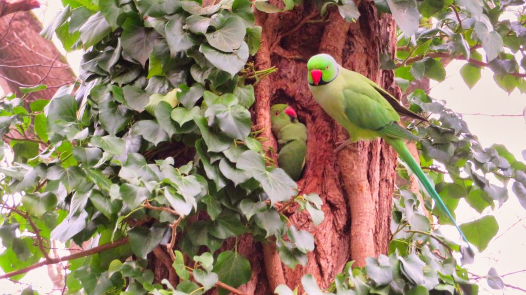In de bomen van het stadspark zitten halsbandparkieten, die vrolijk kwetteren en van tak naar tak springen. Ook zie ik nijlganzen met vier donzige kleintjes, die schattig achter hun ouders aanwaggelen.