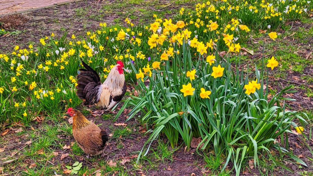 Ik wandel over de Houtlaan waar eveneens fraaie huizen staan. Alles ademt hier de sfeer van lente. De gazons kleuren geel door de narcissen. Tussen de lentebloemen scharrelen een haan met zijn kippen.