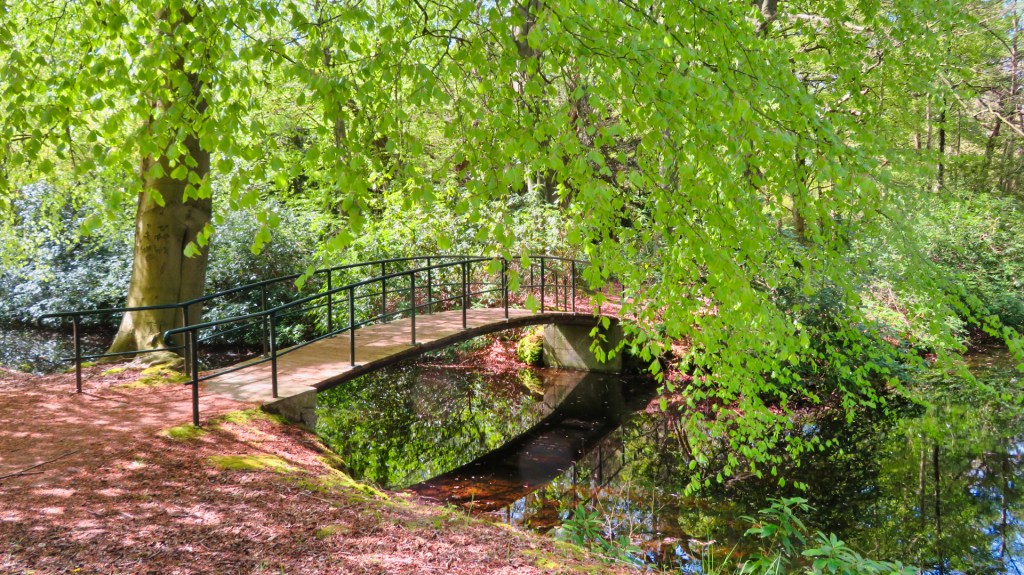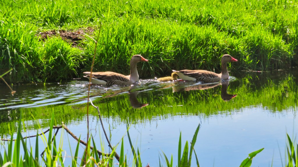 Ik zie grauwe eenden met hun kleintjes zwemmen in het water en zie twee bonte spechten in een boom. Het is een kakofonie van vogelgeluiden en de bomen staan net in blad en zorgen voor een prachtig groen uitzicht.