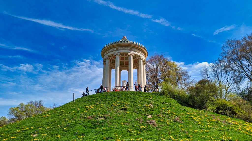 Het beste uitzicht over het park heb ik vanaf de Monopteros, een tempelachtige rotonde die in 1836 samen met een heuvel werd toegevoegd aan het zuidelijke deel van het park. Ik ben niet de enige, die van het adembenemende uitzicht geniet.