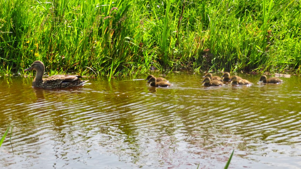 Mijn wandelpad gaat verder door het waterrijke gebied. Boven het hoge gras zie ik de koppen van grauwe ganzen. In de sloot zwemt een eend met haar kroost. De kleine pulletjes zwemmen koddig achter haar aan.