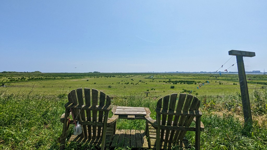 Het uitzicht vanaf Durgerdam is prachtig. Aan de ene kant zie ik het uitgestrekte IJmeer. Aan de horizon zie ik IJburg en het architectonische Sluishuis.