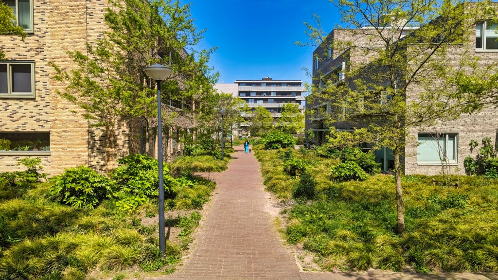 Het is nog maar een klein stukje lopen voordat ik in Amsterdam kom. Ik wandel over een smal pad langs het water en kom bij de grote rode Schellingwouderbrug. Via de brug kom ik in de Sportheldenbuurt. Deze woonbuurt is de eerste op het Zeeburgereiland.