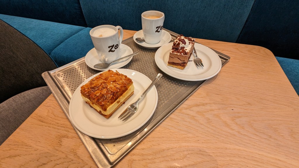 Ik neem even pauze bij Vinzenz Zöttl Bäckerei-Konditorei aan de Gollierstraße. Daar geniet ik van een lekkere kop koffie en een heerlijk stuk taart.