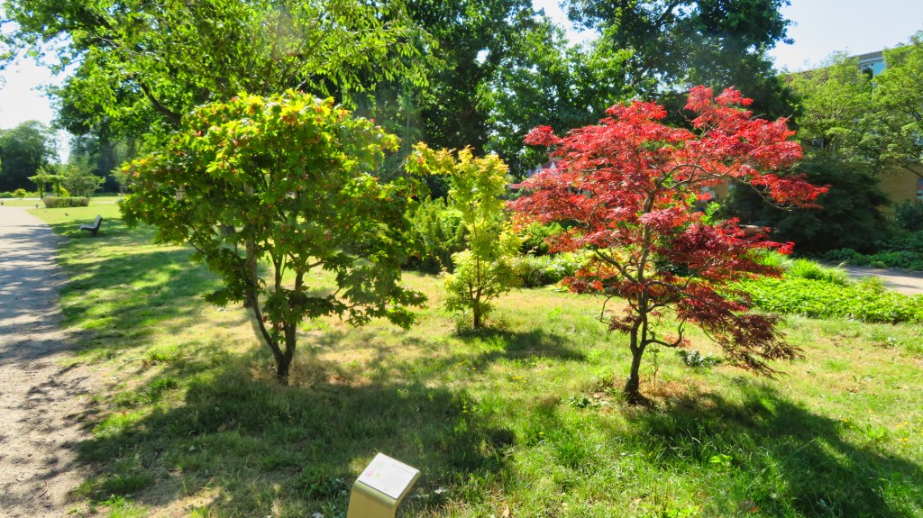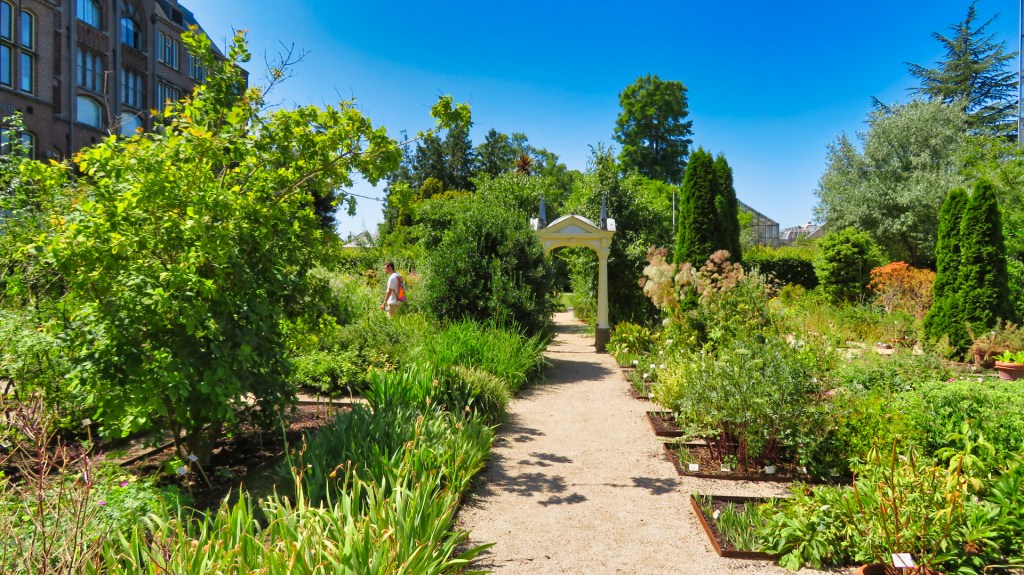 Mijn volgende bestemming is de oudste botanische tuin van Nederland, de Hortus botanicus. Je vindt hier bijzondere planten, die de tuin wereldberoemd hebben gemaakt. Ik passeer de ingang van de Hortus en wandel langs het terras, dat vol zit met dagjesmensen.