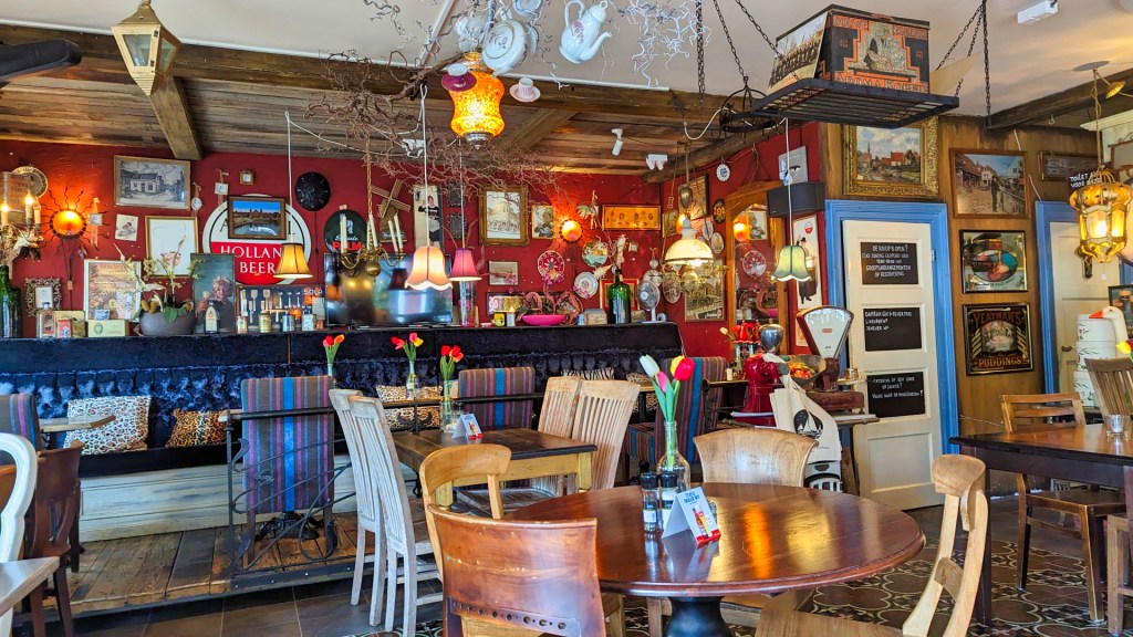 Bij café restaurant De Beurs, waar ik omringd ben door snuisterijen, strijk ik neer voor een lunch.