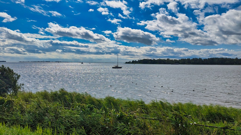Tussen Monnickendam en Volendam loop ik over een rustige grasdijk met fraai uitzicht op het uitgestrekte Markermeer. De zon glinstert in het water en boven mijn hoofd zie ik de prachtige Hollandse luchten.