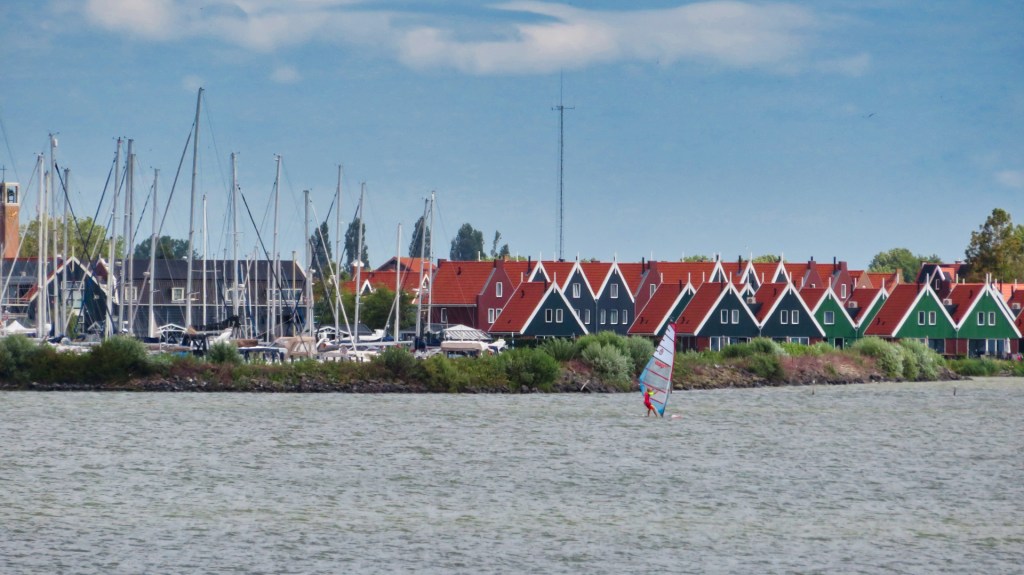 Al snel zie ik de karakteristieke groene houten huizen van Volendam opdoemen aan de horizon. Voordat ik het toeristisch gebied binnen loop, wandel ik langs een jachthaven met vakantiewoningen in dezelfde stijl.