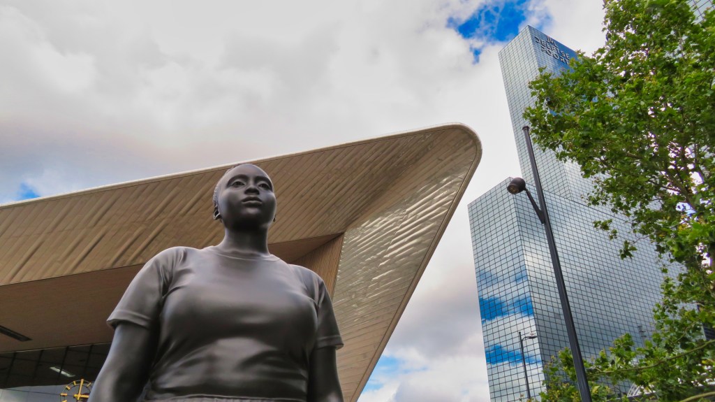 Op de terugweg naar Rotterdam Centraal bewonder ik het nieuwe beeld “Moments Contained” van kunstenaar Thomas J Price. Het beeld, een jonge vrouw van bijna vier meter hoog, zal vijf jaar lang op het Stationsplein te zien zijn.