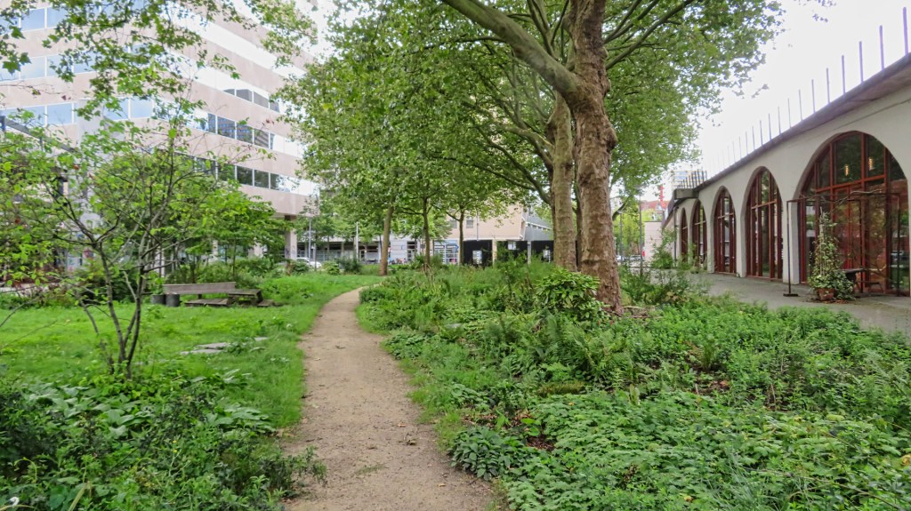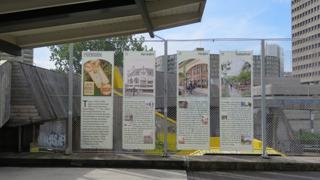 Via een trap verlaat ik de Luchtsingel en loop ik langs de Hofbogen, een Rijksmonument met een verleden als elektrische spoorlijn. Ik passeer het restaurant Bird en Brewpub Reijngoud. Ik vind het mooi om te zien dat dit verpauperde viaduct in 2006 werd gekocht door Havensteder en Vestia en op het bijna twee kilometer lange dak van het voormalig spoorviaduct het Hofbogenpark komt.