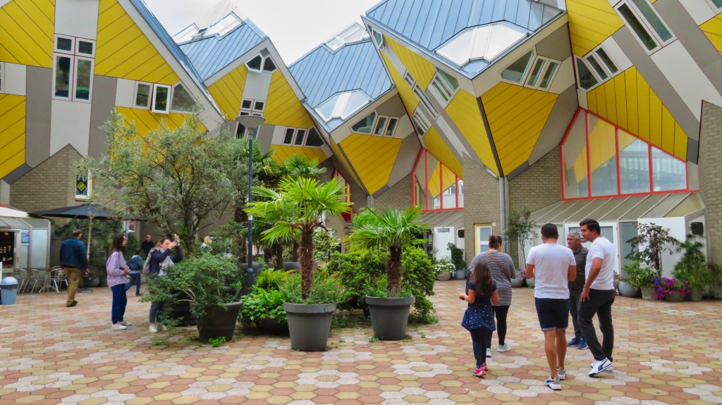 Het bevat 38 wit gele kubuswoningen en diverse bedrijfsruimten, ontworpen door Piet Blom. Vanaf de kubuswoningen heb ik een fraai uitzicht op de oude Haven en zie ik het Witte Huis, een indrukwekkend gebouw met jugendstilmozaïeken, dat ooit het hoogste kantoorgebouw van Europa was.