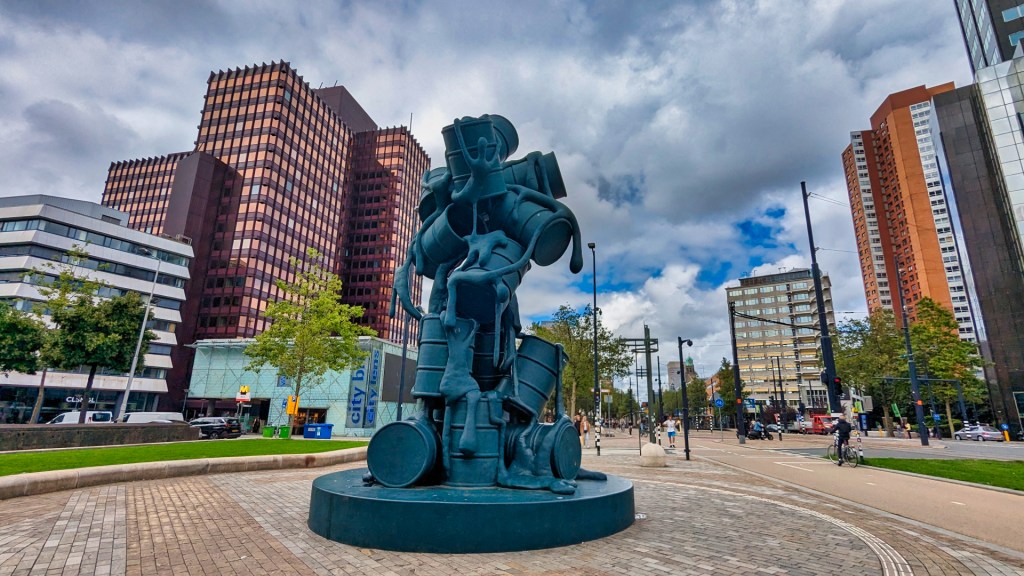 Op de kruising van de Coolsingel en de Blaak sta ik oog in oog met het kunstwerk “Cascade” van Atelier Van Lieshout. Het bestaat uit een toren van achttien olievaten, verbonden door poppetjes, die omhoog klimmen en vallen. Ik wandel verder over de Coolsingel, dat door de nieuwe herinrichting met meer ruimte voor voetgangers en fietsers een mooie uitstraling heeft gekregen.