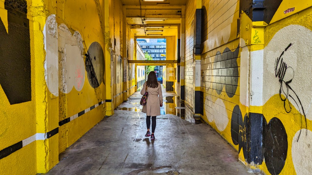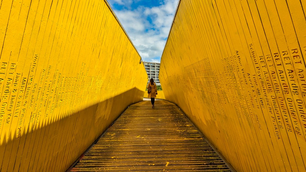 Mijn eerste stop is bij de Luchtsingel, een knalgele loopbrug, die in 2015 werd geopend een crowdfundingsactie. Ik vind het een mooi initiatief, maar ik zie dat de brug kampt met verval, graffiti en zwerfafval. Gelukkig zijn er binnenkort reparaties aan de brug gepland.