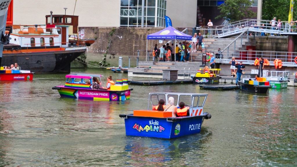 Ik passeer het Maritiem Museum. Voor het museum zie ik kinderen in kleine bootjes op het water. De kleintjes in een politieboot, Rotterdam Prideboot en zeeschip met containers vind ik een schattig gezicht.