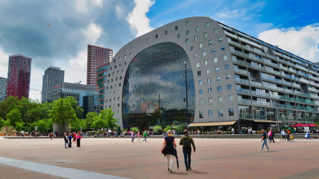 Bij de Markthal aangekomen, zie ik de immense overdekte markthal met een unieke combinatie van woningen en marktkramen. Ik kijk omhoog en bewonder het kunstwerk “Horn of plenty” van Arno Coenen en Iris Roskam, dat de Markthal de bijnaam “Nederlandse versie van de Sixtijnse Kapel” heeft gegeven.