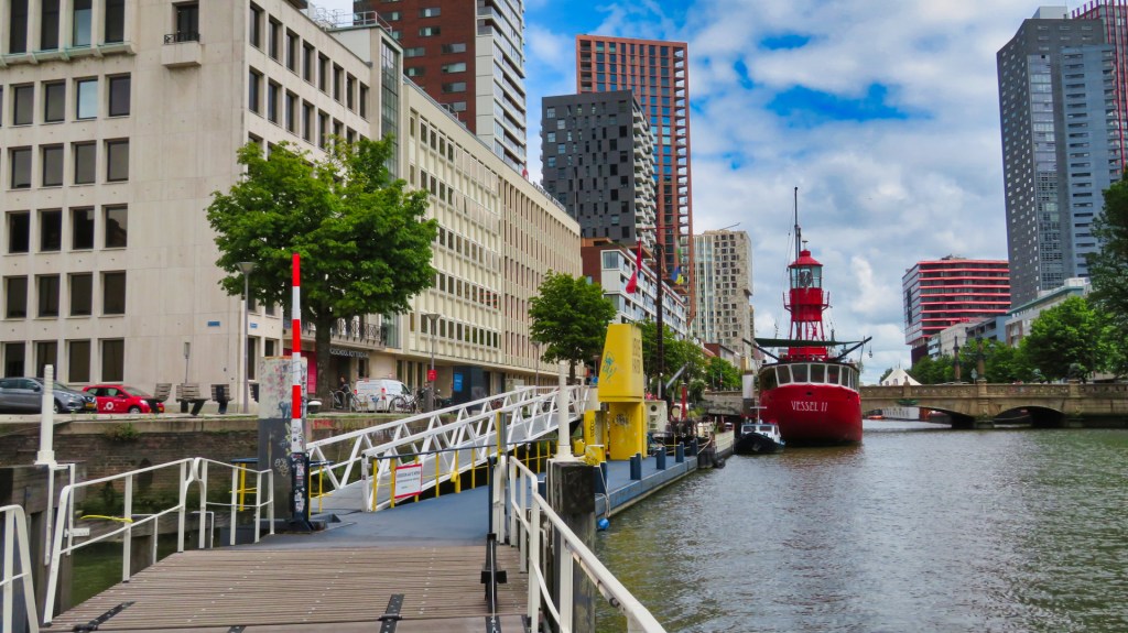 Na een bezoek aan de bekende kubuswoningen, waar toeristen druk bezig zijn met het maken van selfies, word ik in het Engels aangesproken door een vrijwilliger. Ik antwoord vriendelijk dat hij me ook in het Nederlands kan helpen. De Blaakoverbouwing, die ik passeer, verbindt sinds 1977 het historische Oude Haven-gebied met de binnenstad.