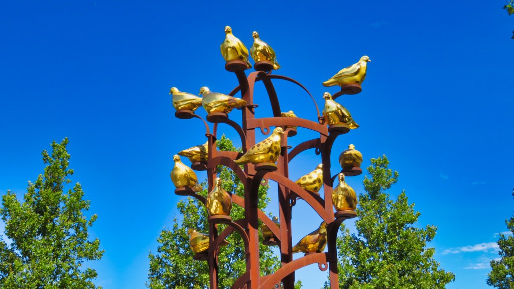 Terwijl ik verder wandel, valt mijn oog op een kunstwerk van 17 goudkleurige duiven, gemaakt door Marte Röling. Dit kunstwerk herinnert aan het 650-jarig bestaan van Weesp.