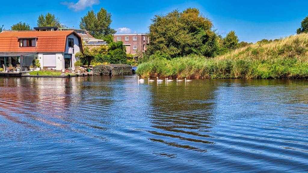 Tijdens mijn wandeling langs het water zie ik een zwanenechtpaar met jongen, wat een gracieus gezicht is. Ondanks de langsvarende boten zwemmen de zwanen stoïcijns door.