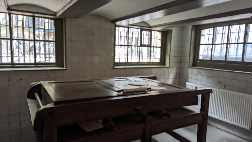 Het personeel had hun eigen ruimte in de keuken en de poetskamer. In de kelder duik ik in het verleden van het personeel. De vrijwilliger laat me een oud apparaat zien, een mangel genoemd. Een ingewikkeld woord voor iets waarmee vroeger kleren werden gedroogd en gestreken door ze tussen rollen te laten lopen. En voor kleinere kledingstukken hadden ze iets dat lijkt op een plank waarmee kreukels werden gladgestreken. Wat ik ook interessant vind, is de herkomst van het spreekwoord “door de mangel halen”. Dit komt eigenlijk van deze mangel, omdat textiel ertussen werd geperst om het vocht eruit te halen. Figuurlijk betekent het iemand onder druk zetten.
