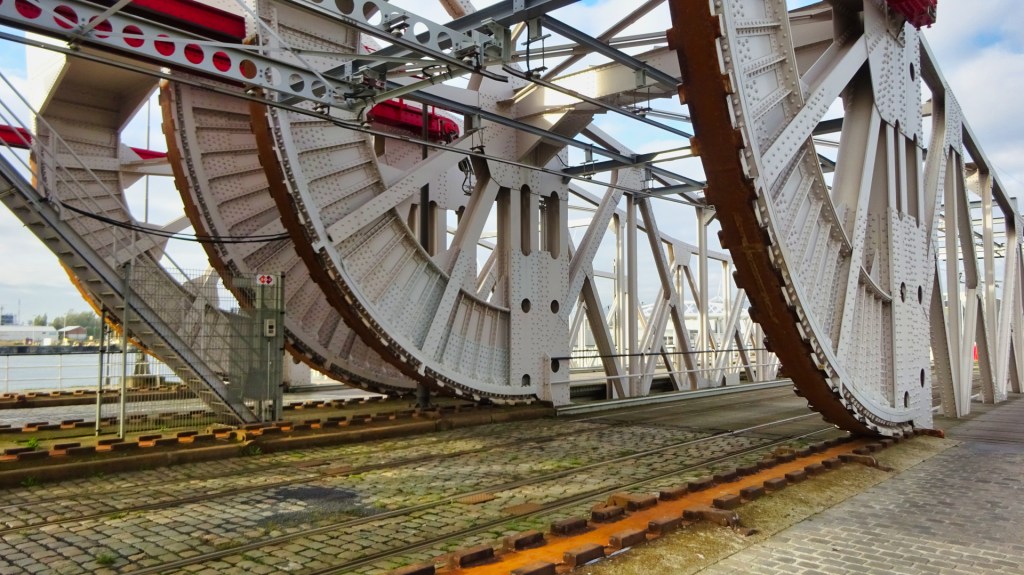 Eén van de eerste bijzondere plekken die ik tegenkom, is de imposante Mexicobrug, een beschermd monument dat het Kattendijkdok en het Houtdok met elkaar verbindt. Deze rolbasculebrug is niet alleen functioneel, maar heeft ook een historische betekenis als voormalige enkelsporige spoorbrug.