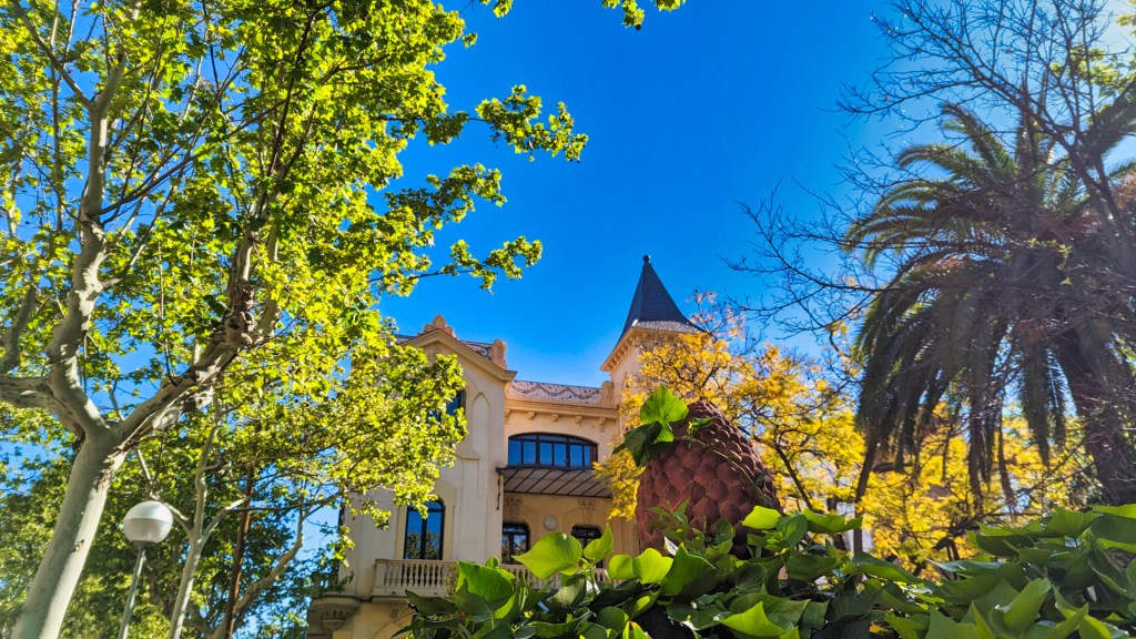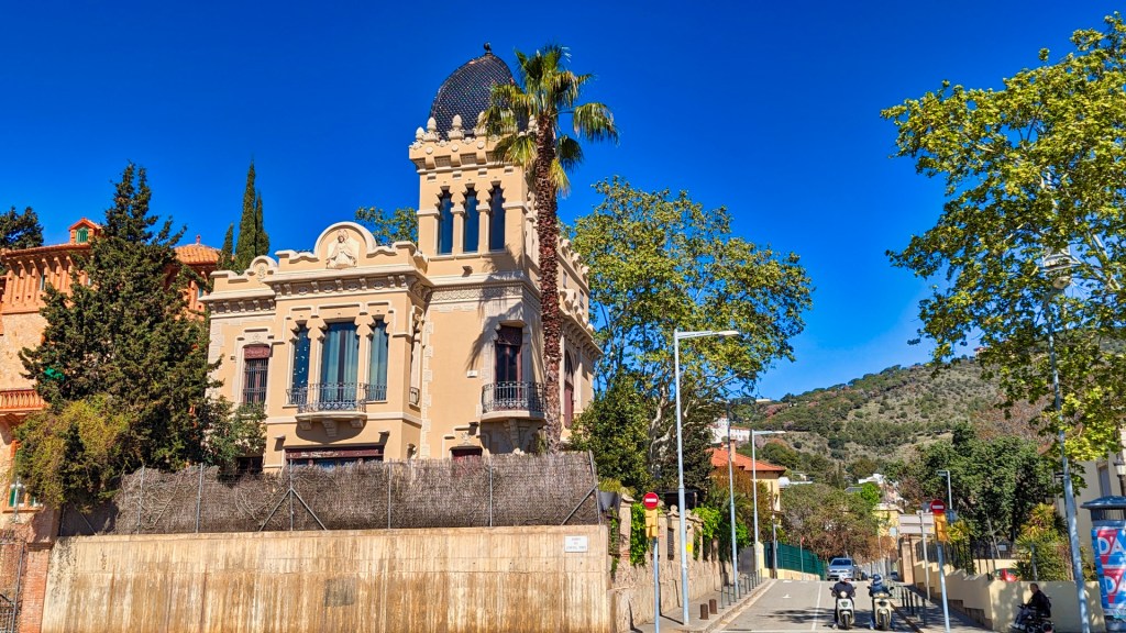 Na mijn bezoek aan de begraafplaats, pik ik de route weer op en ik loop door de schaduwrijke Paseo Bonanova. Onderweg kom ik langs een groepje jongeren, gekleed in designer kleding. Aan de overkant bewonder ik een opmerkelijk staaltje architectuur van Enric Sagnier uit 1919: het Raymundo Deloustal House, ook bekend als de Pujol-toren. Deze modernistische woning is verfraaid met talrijke sierelementen, waardoor het haast een ontwerp van Antoni Gaudí zou kunnen zijn.