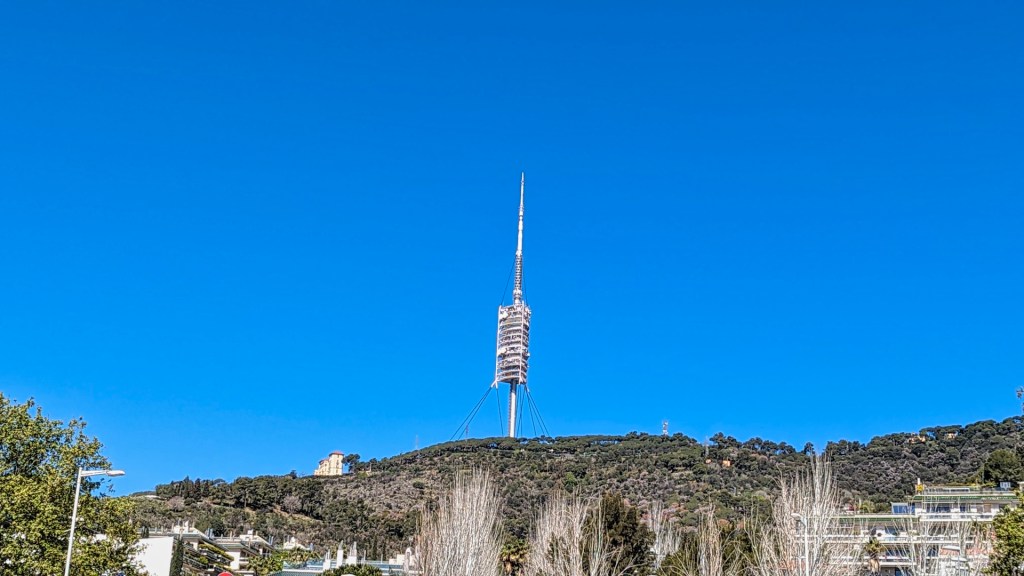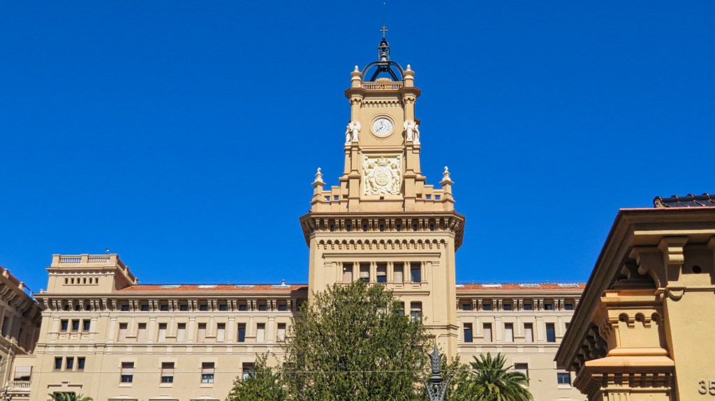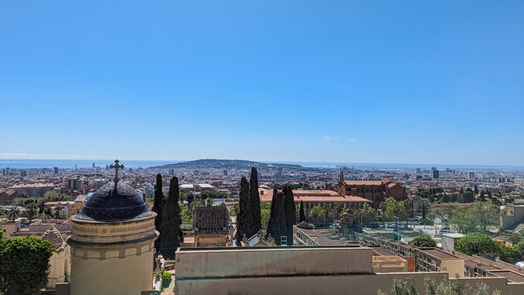 Ik steek een drukke weg over en stijg een behoorlijk stuk. Ik passeer een aula van de begraafplaats Sant Gervasi, waar ik op uitkijk. Vanaf dit punt heb ik ook een mooi uitzicht over Barcelona. Ik zie de Olympische torens bij Barceloneta en Torre Agbar.
