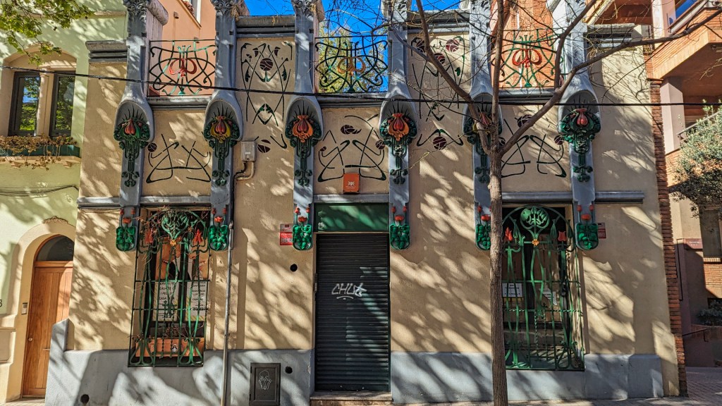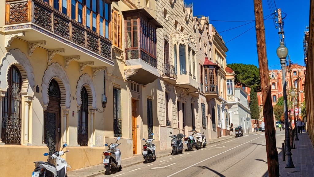 In de Calle Carrasco en Formiguera bewonder ik een rijtje huizen uit 1905, ontworpen door de architect Josep Arnau Piera. Elk huis is prachtig op zijn eigen manier. Veel van de villa’s zijn versierd met sierlijke ornamenten en balkons.