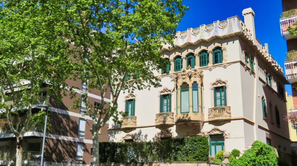 Ik heb Cosmocaixa al eerder bezocht en gezien het prachtige weer vervolg ik mijn wandeling. Ik passeer bij Quatre Camins een modernistisch huis uit 1914 van de architect Eusebi Climent Viñolas. Het witte huis met mozaïek en sierlijke elementen vind ik erg mooi.