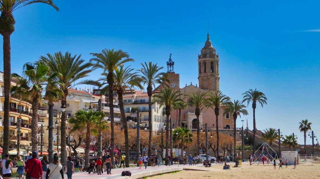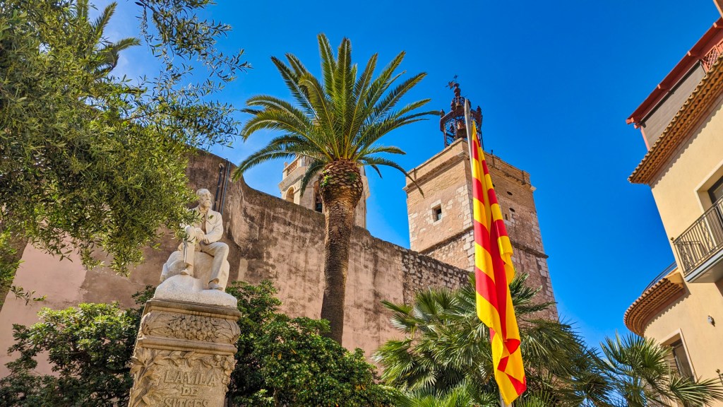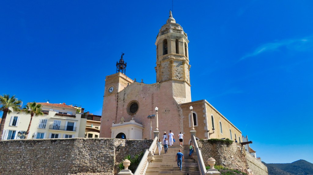 Ik wandel naar de Kerk van Sant Bartelomeu en Santa Tecla. Deze kerk is het beeldmerk van Sitges en komt op bijna elke foto van de stad voor. De ligging op een kleine, in zee uitstekende, rots in het centrum van het stadje maakt hem bijzonder. Door de Sitgetanen wordt deze plek ‘La Punta’ genoemd.