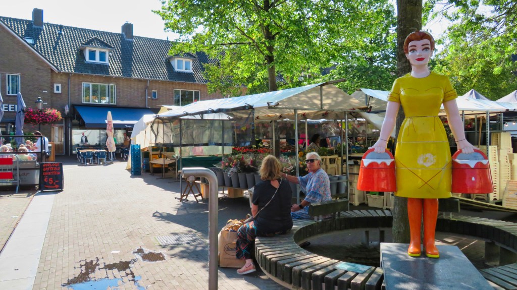 Het is zaterdag en het plein staat vol met marktkramen. Ik ben nog op zoek naar het beeldje van het Melkmeisje, gemaakt door kunstenares Berry Holslag. Na wat navraag wijzen twee marktbezoekers me het beeldje. Het staat verdekt opgesteld achter een groentekraam.