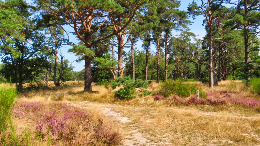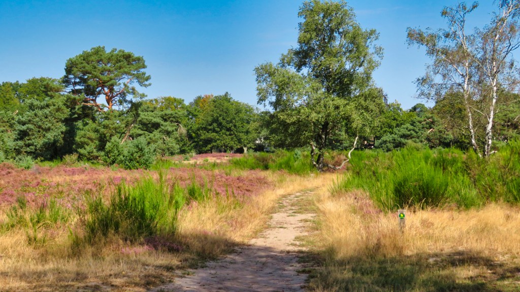 Ik wandel tussen bloeiende heide met hier en daar een dennenboom. Ik zie andere wandelaars, sommigen met honden waarvan alleen de staarten boven de paarse heide uitsteken. Ik vind het een grappig gezicht.