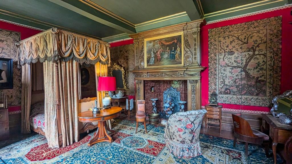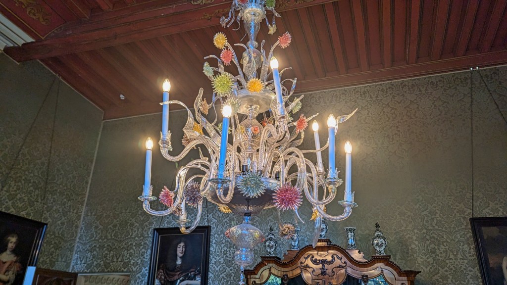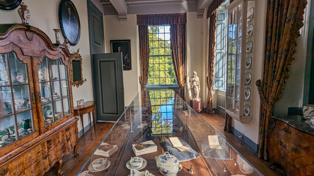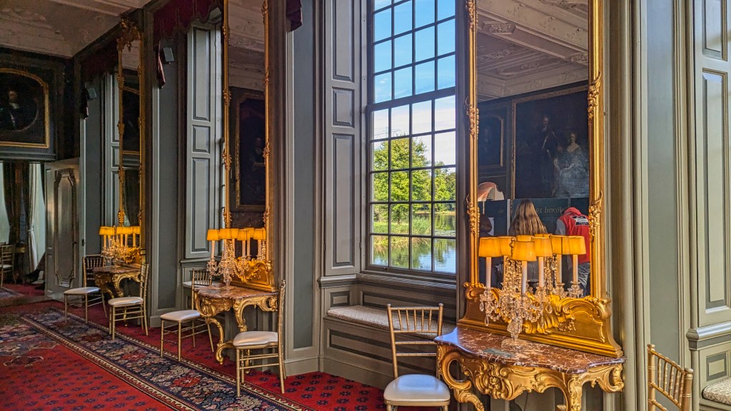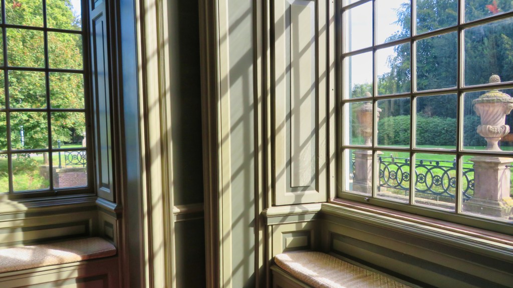 Ik dwaal door de verschillende kamers van het kasteel, elk met kleurrijke tapijten en goed bewaarde meubels. Het zonlicht valt prachtig door de ramen. Ik ga even zitten op een bankje bij het raam om van het uitzicht te genieten. Op de ramen zijn informatiepanelen geplaatst, die uitleg geven over bijvoorbeeld de zichtlijnen in de tuin. Boven bekijk ik nog een aantal kamers met bijzondere serviezen en porseleinen stukken.